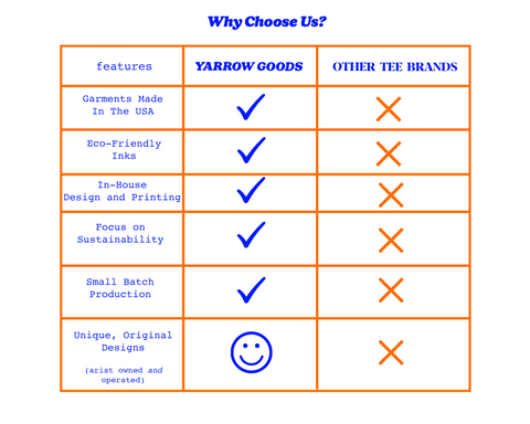 Yarrow Goods is an online apparel and textile company featuring eco conscious textiles, materials and unisex apparel. We feel graphic tees can be tasteful, comfortable, and well made for the long haul. Almost all of our garments are made in America, designed in the USA and printed in the USA featuring 100% ring spun cotton. We screen print all of our tees by hand in sunny California in our studio. We are a family owned and operated company.